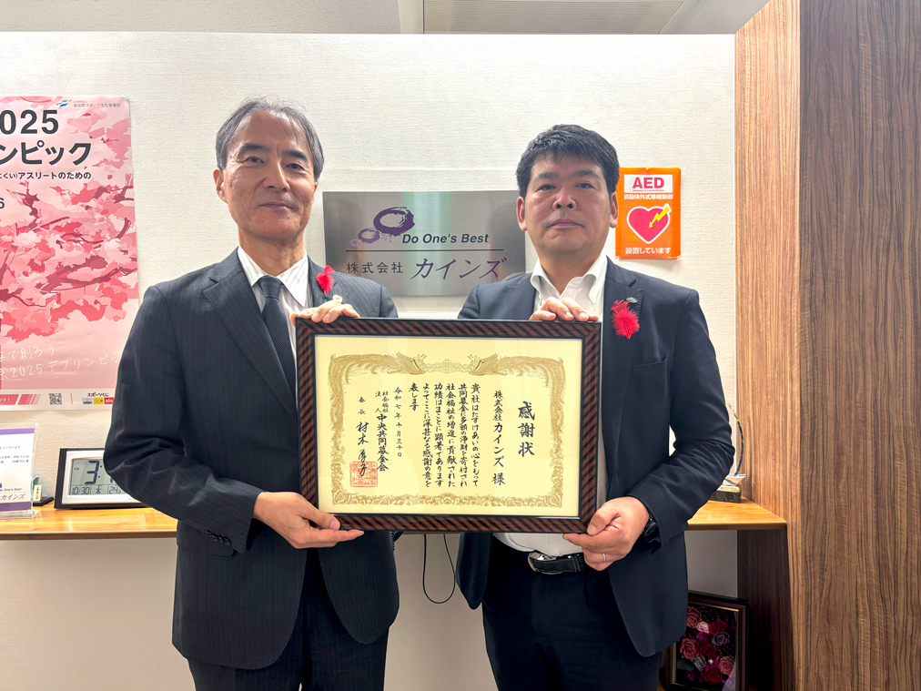 令和7年10月30日、中央共同募金会(赤い羽根共同募金)常務理事の川久保重之様、総務企画部 広報・募金推進室 主事の小田若奈様が当社に来訪され、毎年の継続した寄付活動に対し感謝のお言葉と感謝状を頂きました。
